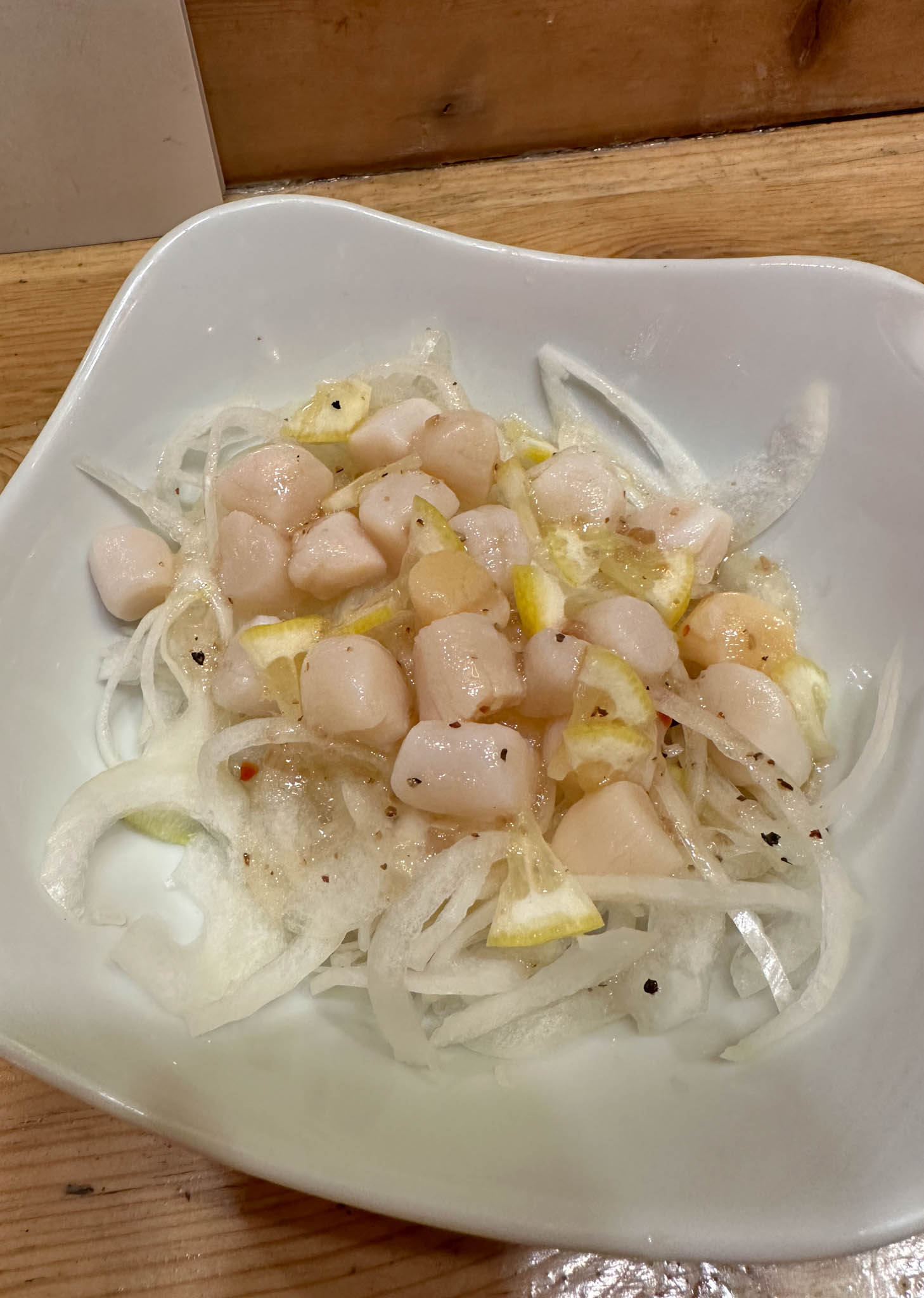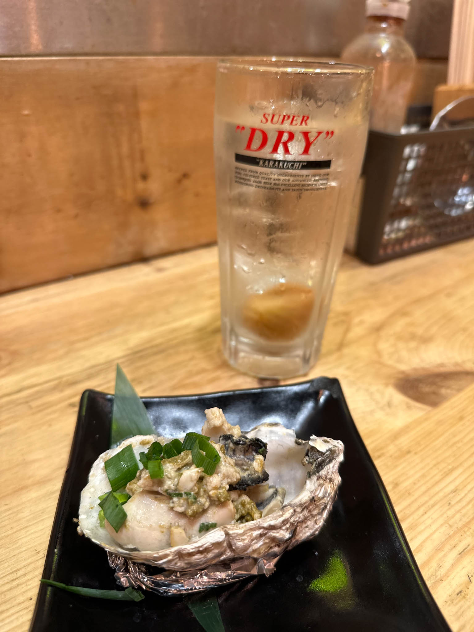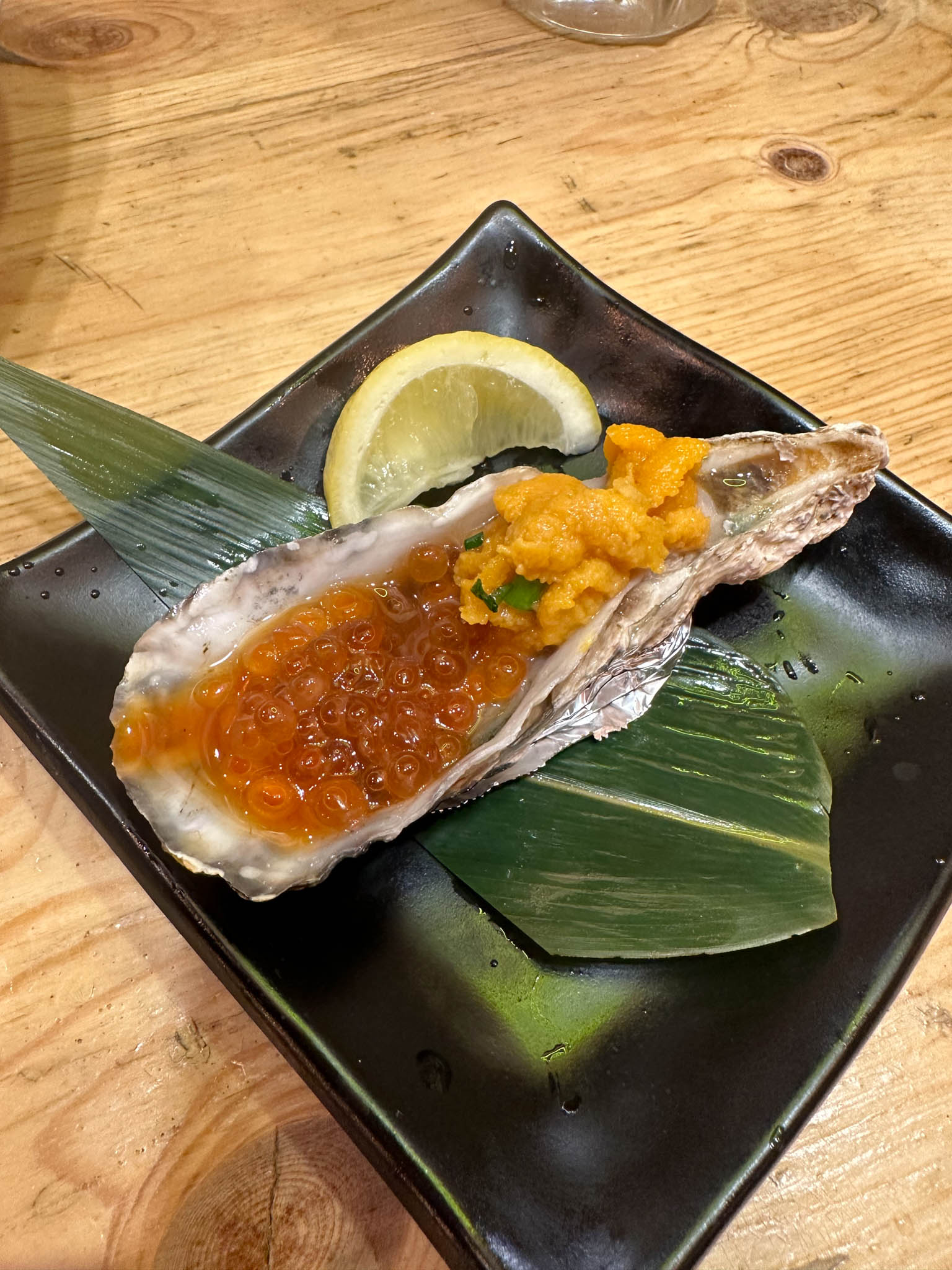 The menu was in Japanese but thankfully there were photos. I ordered the oyster with uni & ikura along with a broiled oyster. The scallops turned out to be an mis-order because it was actually an onion salad. Well, this is how Japan is for me, I point at menu items and hope for the best.