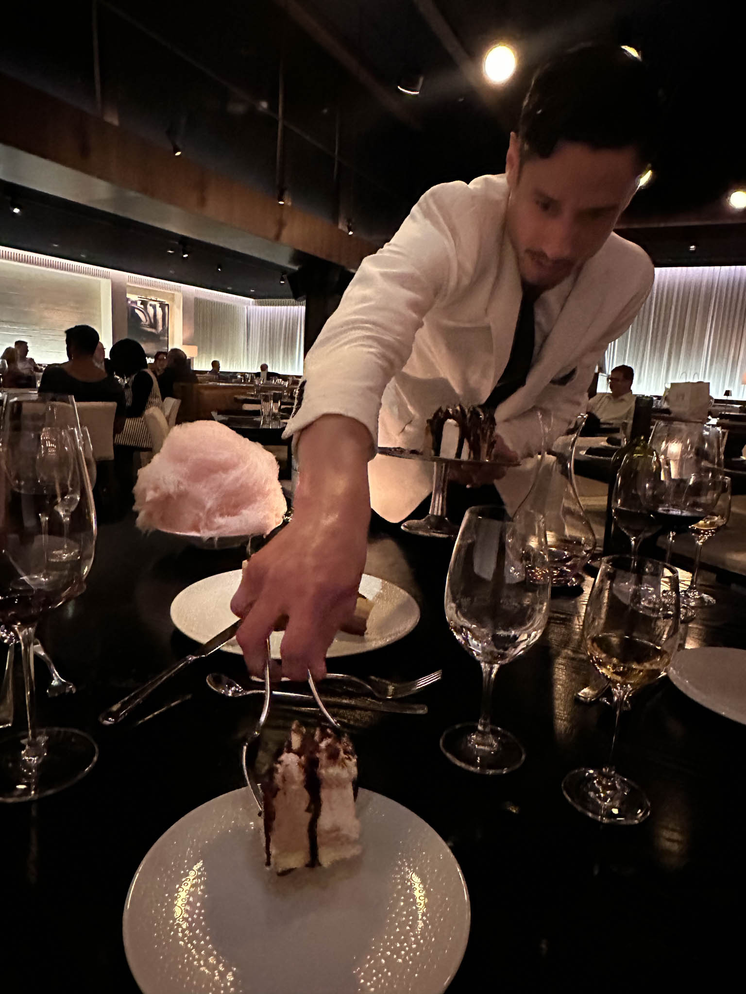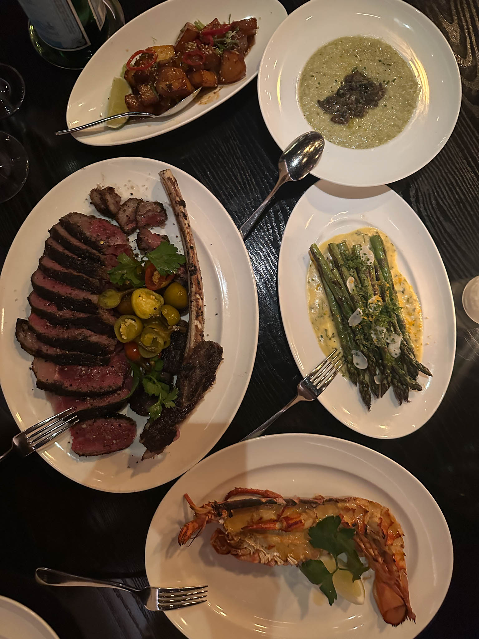 Then the star of the show hit the table, a humongous Westholm Wagyu Tomahawk steak which was cooked a delectable medium-rare and carved table-side. Not that we needed any more food, a generous amount of “sides” were also presented including a ramp risotto, Japanese sweet potatoes and asparagus with Bearnaise. Oh, there was also the half a lobster in spicy miso butter sauce that I was told to dredge the steak pieces through after we polished off the succulent pieces of lobster.
