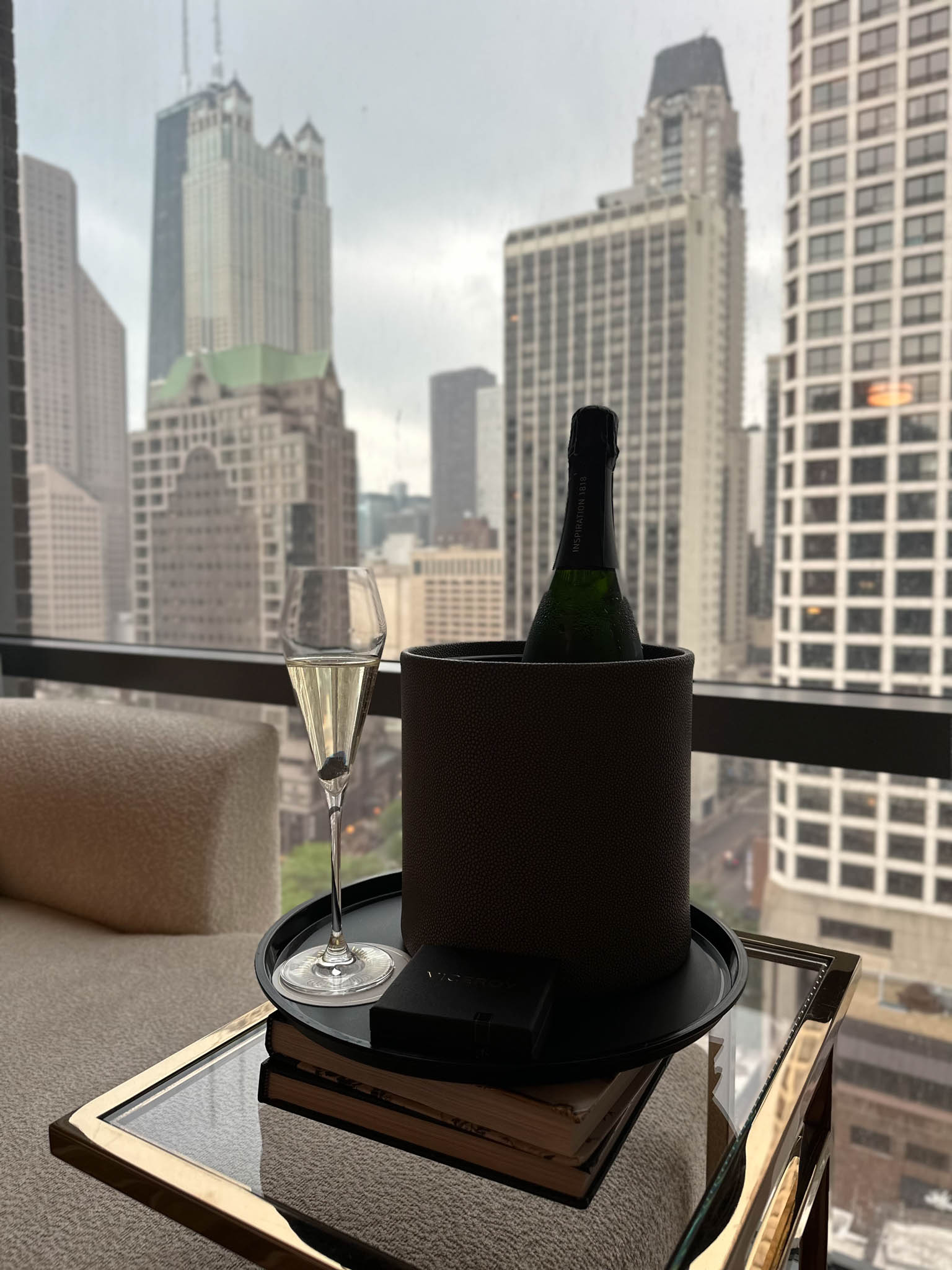 A late afternoon landing at O’Hare coupled with stormy weather, meant being stuck in traffic for almost 2 hours into the city. It meant having to pass on having a Portillos dog, my first planned eating stop for the weekend. No matter though, the hotel graciously greeted us upon arrival with a glass of sparkling and then with a bottle + chocolates in the room as a treat for my special weekend ahead that made me forget that I was hungry.