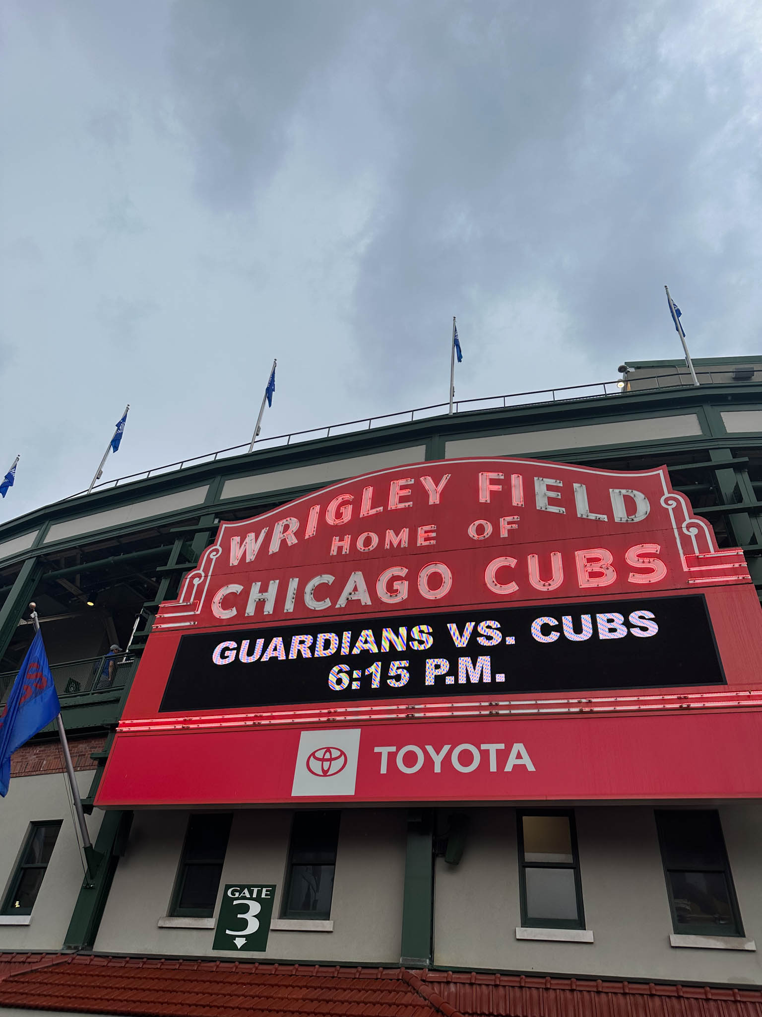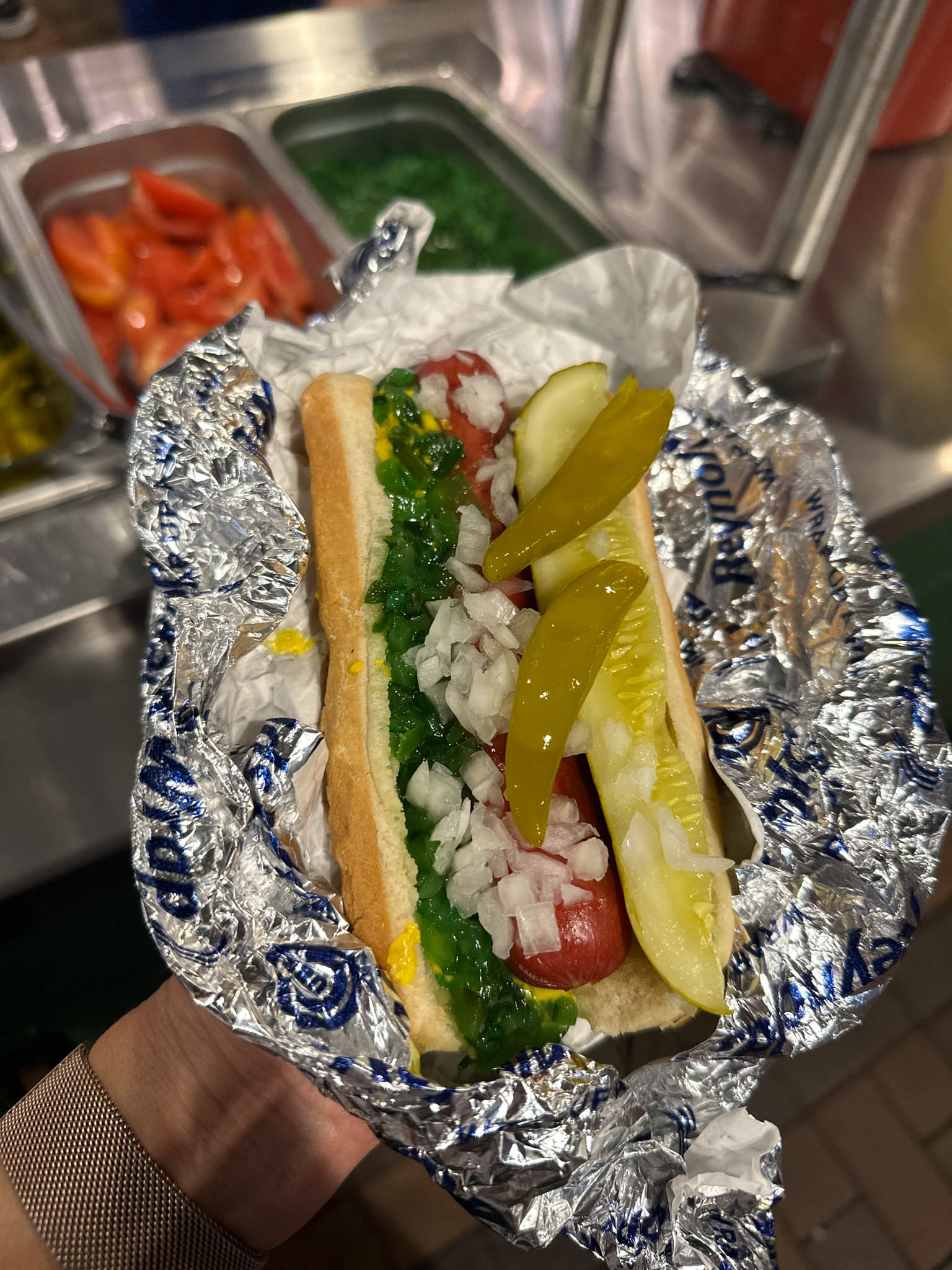 We couldn’t be in Chicago without going to see the Cubs play at Wrigley, but unfortunately the rain prevented us from actually catching the game. After waiting 3 hours in the bowels of the stadium hoping for the rain to let up, I decided (for this trip) it would be enough to have a Wrigley dog with its neon green relish, and giant pickle and peppers and call it a night.