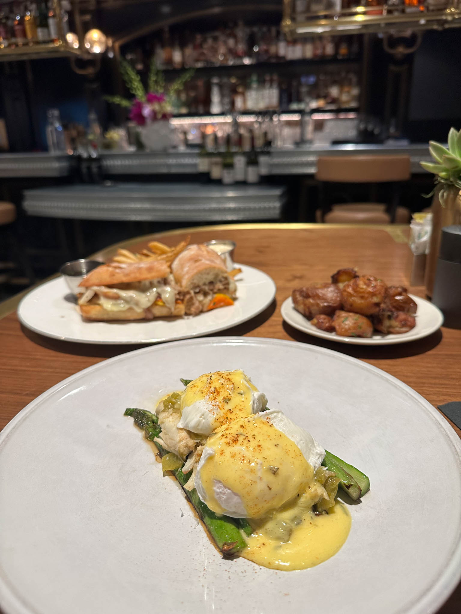 I was totally drenched when I arrived back to the hotel after class and with my phone buzzing with “extreme weather” alerts advising anyone who didn’t need to be out to shelter in place. Feeling like it would be impossible to get a car to go for my planned brunch destination, we chose to stay close and go to Brass Tack,inside the Waldorf Hotel.