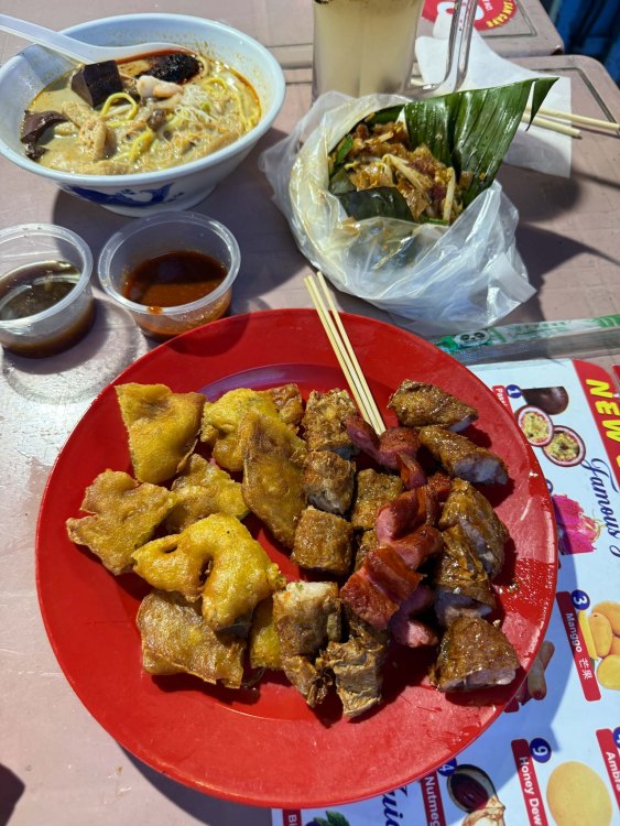 Stepping outside, we realized we were once again near New Lane Hawker Centre, this time with more stalls open. I was finally able to cross curry mee off my Penang-must list. The bowl was rich and coconut-forward. I ordered alongside a plate of lor bak: crisp, spiced pork rolls wrapped in beancurd skin. It was exactly the kind of late-night eating Penang does best.