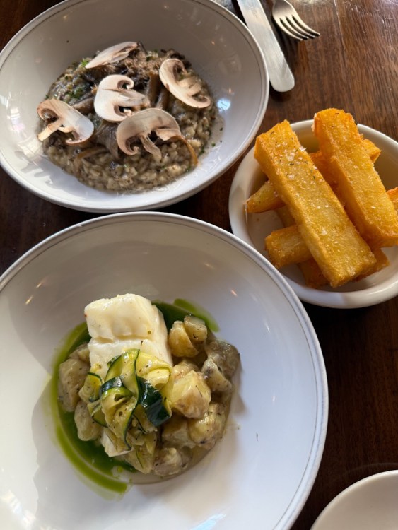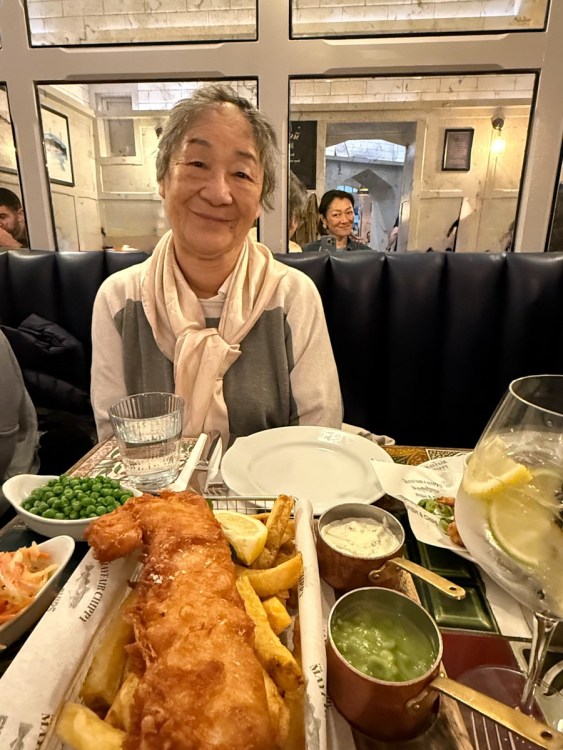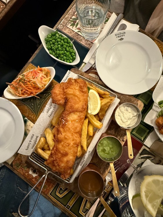 I returned to the hotel to pick up my mom for our first meal. We started with a classic, and one of my mom’s favourites, fish & chips. Mayfair Chippy was close enough to our hotel to walk and it offered her a gentle first glimpse of the city as we made our way there.