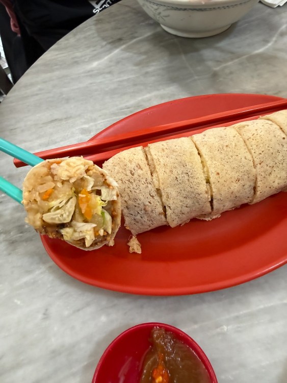 Following Bourdain’s lead, I also ordered a plate of popiah from another stall in the kopitam. Malaysian popiah are fresh spring rolls wrapped in a delicate wheat skin and filled with vegetables, egg, and sweet-savory sauce. It arrived neatly cut into pieces, soft rather than crispy. Its light freshness balanced the deeper, curry-rich flavors of the laksa.